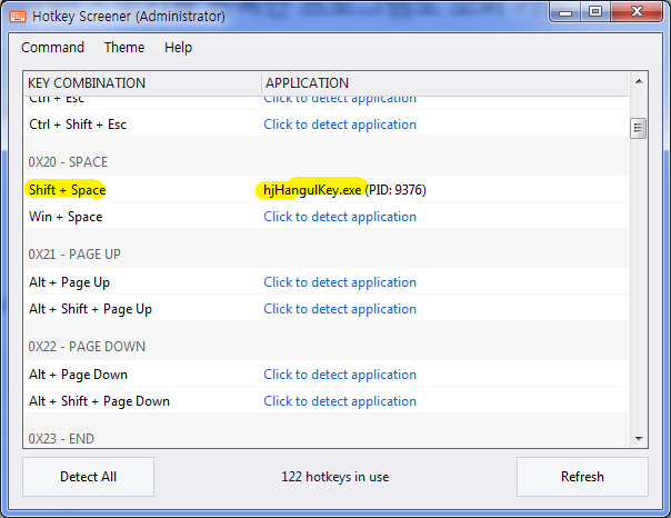 현재 컴퓨터에 등록된 핫키 목록 뿐 아니라, 각 핫키를 등록한 프로그램도 조회됨.