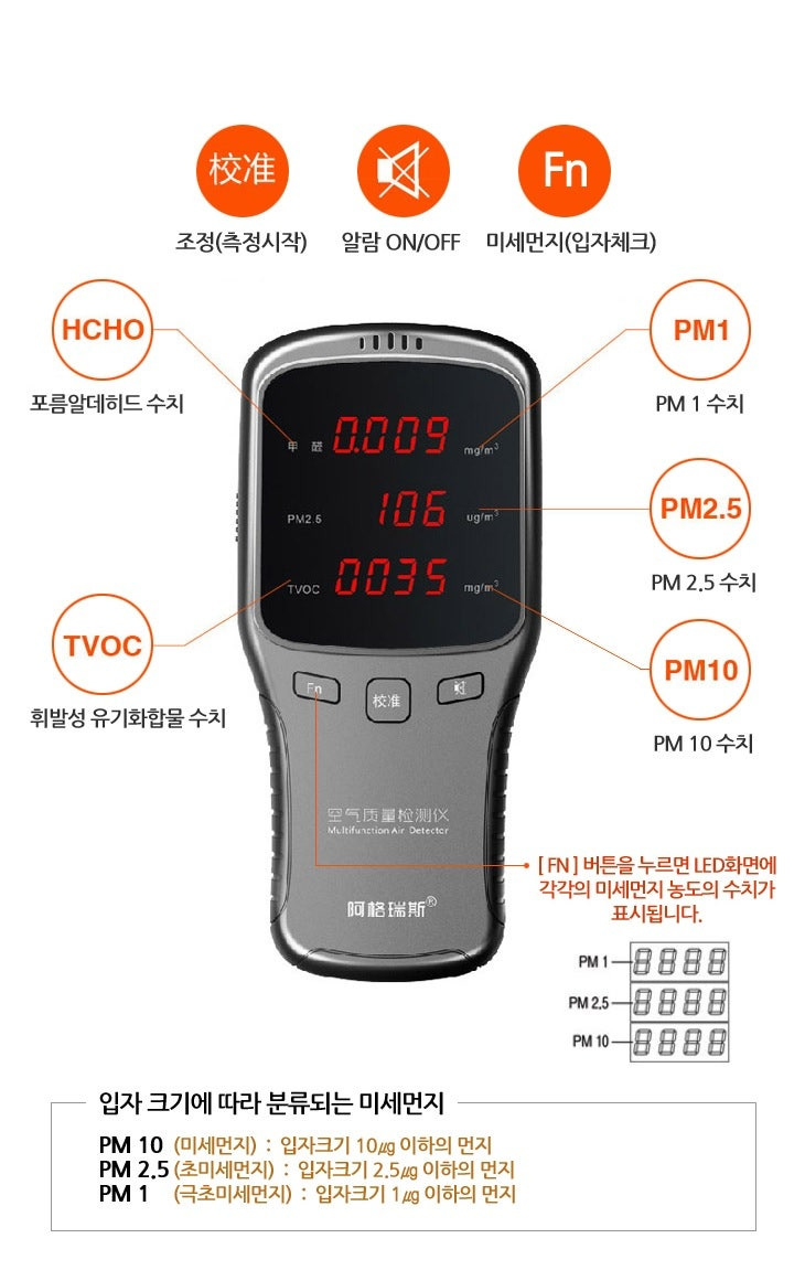 B. 미세먼지 측정 - 별도의 준비 시간이나 절차가 필요 없으며, 전원 키고 3초만에 체크 완료됩니다. - 미세한 변화도 수시로 반영됩니다. - 숫자판 아래 버튼 세 개 중 좌측 "Fn"버튼을 누르면 PM1(미세먼지), PM2.5(초미세먼지), PM10(극초미세먼지) 수치가 순서대로 측정되어 보여집니다.