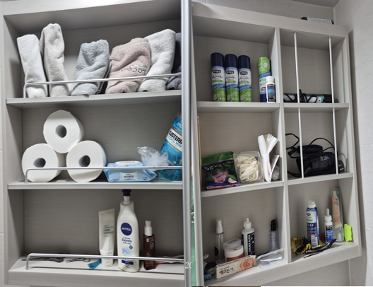 - 수납장 - 양문, 슬라이딩. 겉면 모두 거울, 내부에 가로/세로로 봉이 있음. 세면대 옆쪽칸에 2구콘센트 추가
