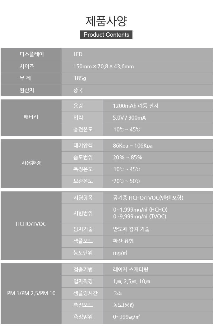 * 전원을 켜면 맨 위의 숫자로 180초의 카운트가 시작되는데 이는 HCHO와 TVOC 측정 준비시간이며, 각 숫자의 의미는 는 다음과 같습니다. - 맨 윗칸 : HCHO(포름알데히드) 수치 - 중간 : 미세먼지, PM2.5 수치 - 맨 아랫칸 : TVOC(휘발성유기화합물)수치 A. HCHO와 TVOC 측정 1. 전원을 켜면 자동으로 시작하는 180초 카운트 다운 끝난 후 2. 신선한 공기가 있는 환경에서 8분간 노출시켜줍니다. 3. 측정을 원하는 지역에서 Cal. 버튼을 3초간 누르면 HCHO와 TVOC 측정값이 잠시 0으로 바뀐 후 측정을 시작합니다. 4. 측정 시작 후, 약 5분이 지나면 대략적인 HCHO와 TVOC 수치가 조정되어 표시됩니다. (단, 경험상, 신선한 공기가 있는 환경에서 8분 노출하지 않고 180초만 지나면, 꽤 정확하게 수치가 표시되는 것을 확인하였습니다.(차량, 아이방, 흡연실, 기타 다수 테스트 완료-세부 리뷰에서 자세히 설명) * 충전 중 LED 안 꺼지고 지속 측정되는 것은 정상입니다.(충전중 LED 끄는 것은 불가능하네요)